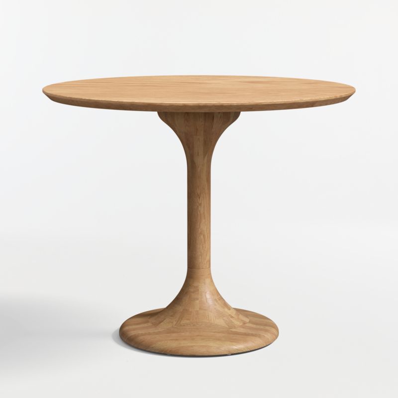 Channeling the look of an iconic example of modern design, our Nero dining table takes this modern classic in a more natural direction in solid white oak. A turned trumpet base sweeps the slender pedestal, supporting a pristine oval top rich with beautiful graining. A great choice for banquette dining, the Nero wood pedestal table comfortably seats four.
