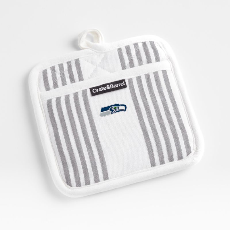 Celebrate your team on game day (and every day). Simple kitchen essentials in quality cotton are striped thick and thin in bright white and soft grey. Our organic cotton pot holder cleans up easily in the washing machine and gets softer with use and laundering. Pair our exclusive hot pad with our other grey-and-white Cuisine Stripe textiles for a classic and coordinated kitchen.