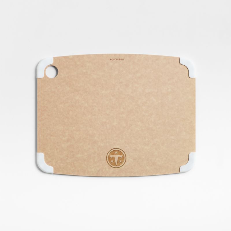 Celebrate your team on game day (and every day). This easy-care cutting board made of wood fiber and resin with a technique that dramatically reduces waste. Dishwasher-safe, reversible board has bright white removable silicone corners keep the board from slipping. Just like solid wood boards, the Epicurean board will develop a patina with use and will develop cut marks, an indication that it's knife safe.