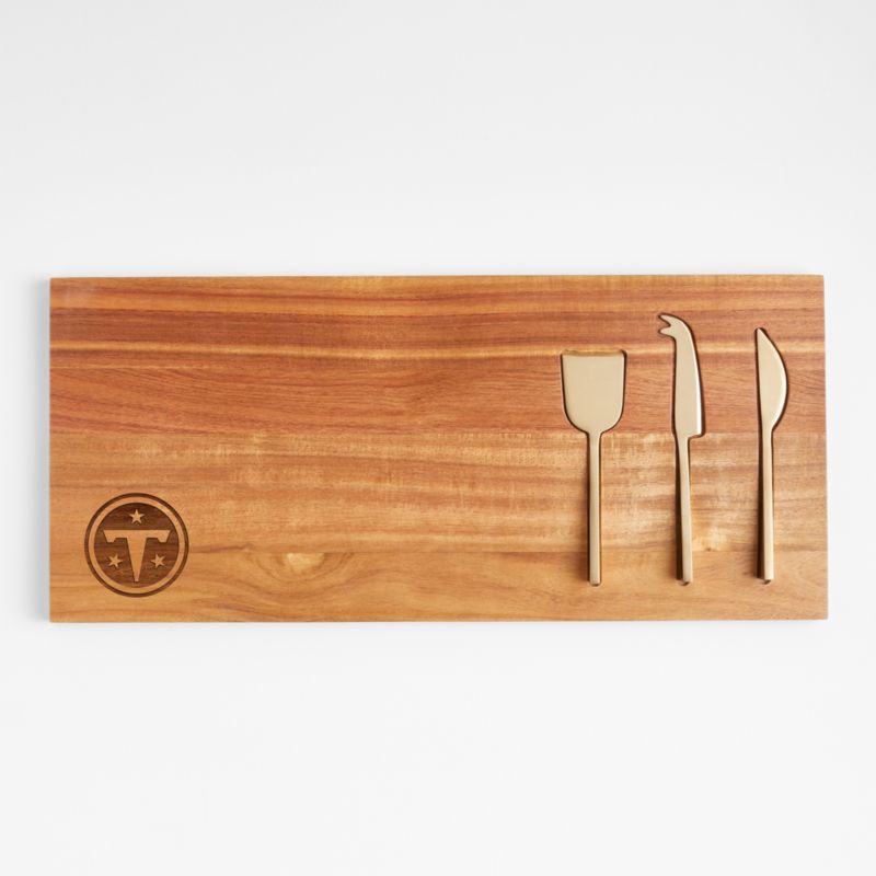 Celebrate your team on game day (and every day). This stunning update on the classic cheese board lets sleek tools take a starring role alongside curated cheeses, fruits and accompaniments. Made of a rectangular plank of gorgeously grained acacia wood, the small board features offset storage slots for three cheese tools, precisely cut to match the elegant shapes of the chisel, pronged and spreader knives. The utensils' angled handles jut out slightly from the slots enabling easy access, and their brushed champagne finish harmonizes beautifully with the warm wood to enhance the board's integrated design.