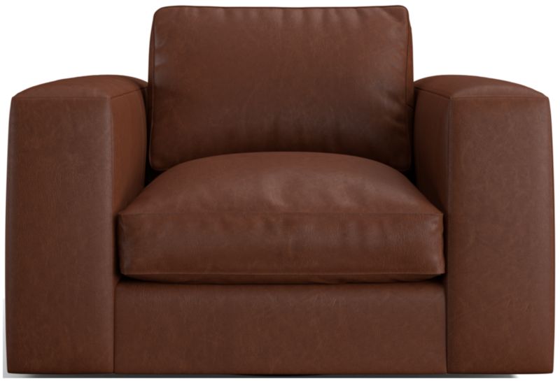 The rich color and buttery softness of top-grain leather brings sleek sophistication to the breezy ease and modern attitude of our Oceanside swivel chair. The wrap-around flow from arm to back gives it a neat, fully finished look from any angle. Soft-yet-structured cushions provide just enough support for a comfortable seat you won't want to leave. We love the generous width of the arms and the room-at-a-glance swivel.