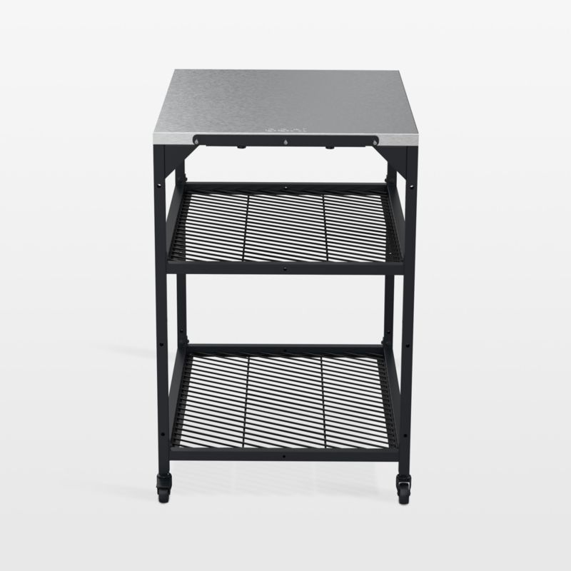 Create the ultimate outdoor pizza station with this modular table, designed to support your Ooni pizza oven (sold separately). Crafted of black carbon steel, the medium table is topped with a sleek stainless steel work surface. Adjust the two shelves to hold the propane tank, wood pellets, waterproof cover and other essentials, and hang cooking tools from the built-in hooks so they're right at hand. Wheels roll the cart from garage to patio or wherever the pizza party happens to be, then lock securely when it's time to cook. The modular table upgrades the already-impressive Ooni pizza-making experience.