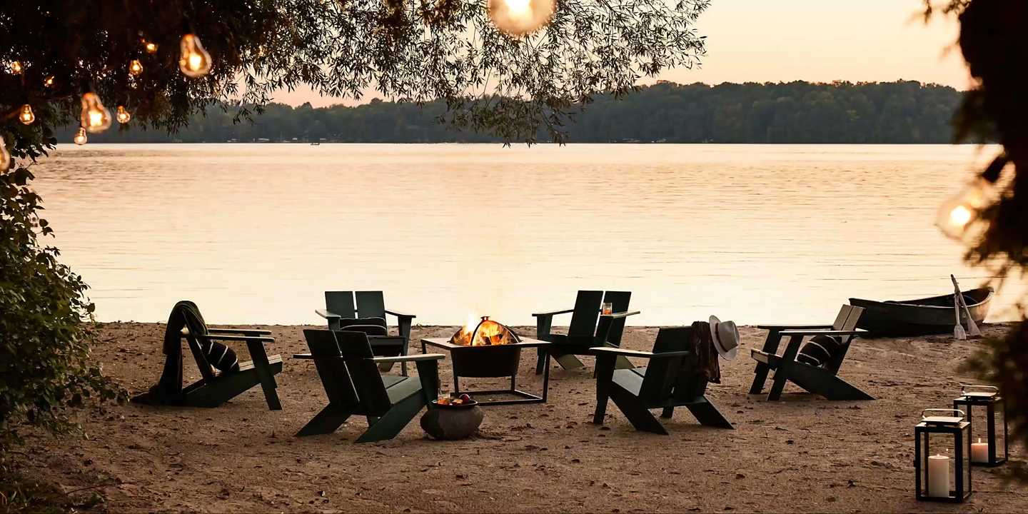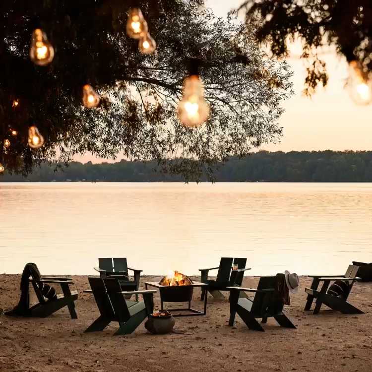 The decor and furniture you use to style the space surrounding your fire pit are just as important as the fire pit itself because these accessories complete the look and amplify the vibe. We love arranging outdoor lounge chairs or timeless adirondack chairs around a fire pit to create a welcoming seating area. Pro tip: Place the chairs with the backs against the wind so the smoke from the fire pit doesn’t get in anyone’s face. To add extra mood, string up globe lights (but never over the flames!) and place outdoor lanterns nearby.