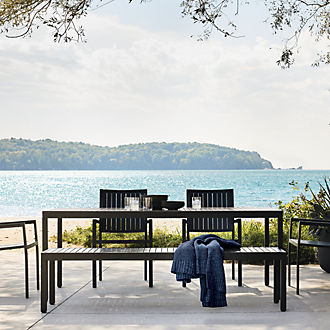An alternative seating option for your backyard meal experience: outdoor patio dining benches. Unexpected and fun, patio benches are easy to mix and match with your garden dining set. Think wood finishes to achieve an effortless touch or go with metal outdoor benches to pair with iron patio dining chairs. Also, keep in mind that backless benches enhance a picnic-like atmosphere, while others with a seatback encourage settling in. Either way, as with other seating options, don't forget to add outdoor lounge furniture with Sunbrella cushions for support.