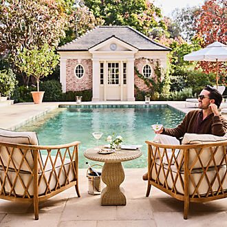Find an outdoor furniture collection that captures your style and suits your needs. Is your yard the spot for neighborhood cookouts? Make sure you have enough outdoor seating for alfresco meals. If the porch or patio has enough space, consider setting up a large outdoor dining table to accommodate each guest. To anchor your outdoor living space, lay a patio rug underneath that complements the color scheme of your dinnerware. For smaller spaces like a balcony or deck, go with a bistro table or other small space outdoor furniture that has enough room for a romantic meal for two. Then, remember to recreate an outside area ideal for relaxation, opt for a row of outdoor patio chaise lounges to give your home a resort feel. Another smart backyard furniture idea is to set up your patio lawn furniture beneath a pergola. To make the area comfortable, start with a few outdoor sofas or a large patio sectional in a U-shaped configuration. Then, add an outdoor patio side table or two to keep summer cocktails and soft drinks easily accessible.