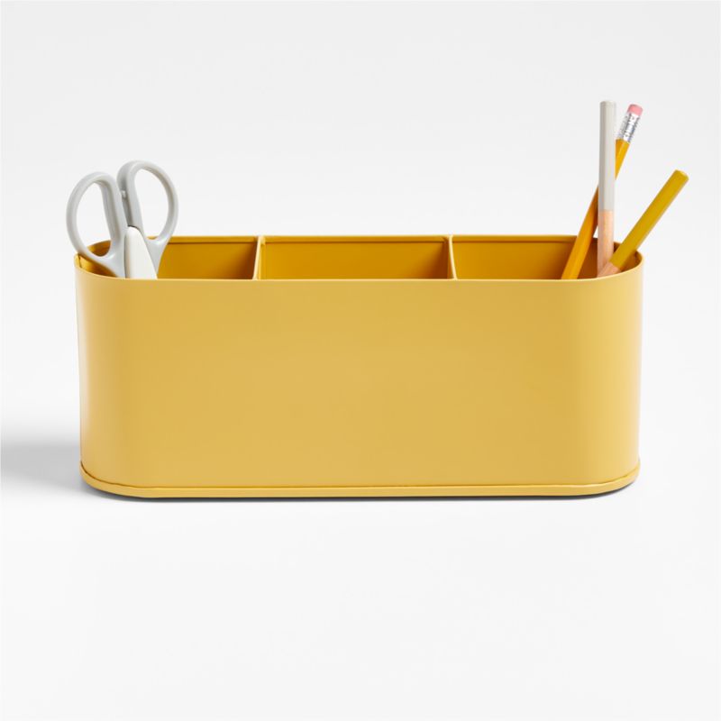 Designed to conquer clutter in the study zone, our Outline metal Study Desk organizer helps kids keep pens, crayons, scissors and more sorted and stored with precision and style. Durable galvanized metal construction and an ocher yellow powdercoat finish help it weather the years beautifully with a minimalist silhouette that fits in anywhere. The three compartments are deep enough to corral a bunch of pencils and keep rulers and brushes upright and always within easy reach. Partner this caddy with the coordinating Outline metal storage bin and wall shelf for a designer approach to modern organization. What's more: this kids' organizational solution makes for a thoughtful gift.