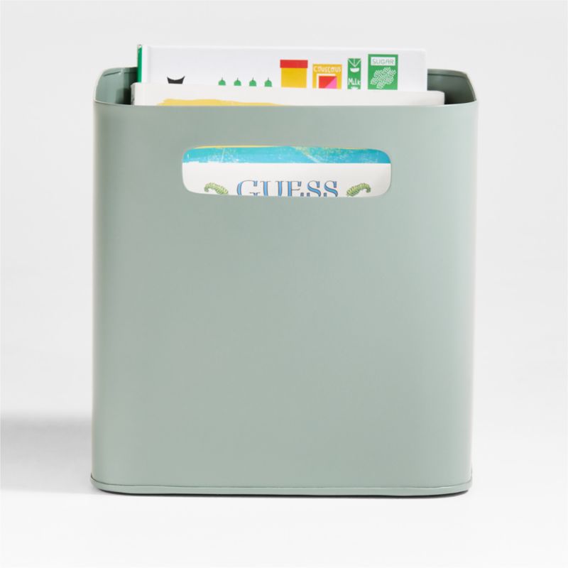 Contain anything and everything with our simple, stylish Outline metal storage bin. Designed for versatility and built to handle years of use, the sage green iron bin is deep enough to keep books upright, craft supplies organized or study essentials always where you need them. The fun color and rounded edges look great and slide into a bookshelf cubby or kid's desk. Cutout handles on each end are easy for little hands to grip. Our exclusive bin also serves as a video game storage solution for older kids.