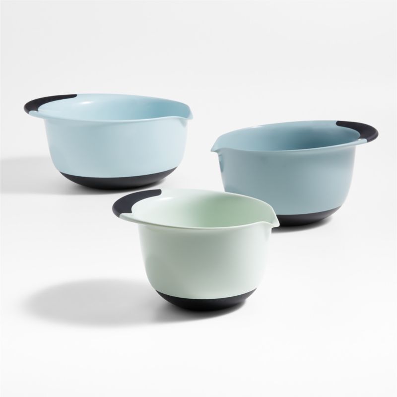 A trio of mixing bowls in light blue, grey and green hues bring a fresh look to countless cooking and baking tasks. Fitted with non-skid bases, pouring spouts and wide, non-slip handles, the bowls offer stability and are easy to handle. This set comes in handy for beating eggs, marinating meat, kneading bread dough and more, then cleans up easily in the dishwasher and nests for compact storage.