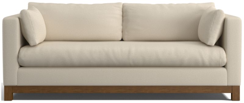 Long, low and made for lounging, the Pacific sofa complements contemporary living rooms with its easy, breezy style. Sustainably sourced wood with a light finish anchors the bench sofa with square legs and a full rail. Along with pillowy back cushions and supportive bolsters, the bull-nosed seat ensures a comfortable stay with a medium-density, not-too-deep cushion. You'll love it upholstered in Olef, a 100% recycled fabric with subtle textured slub and marled yarns.