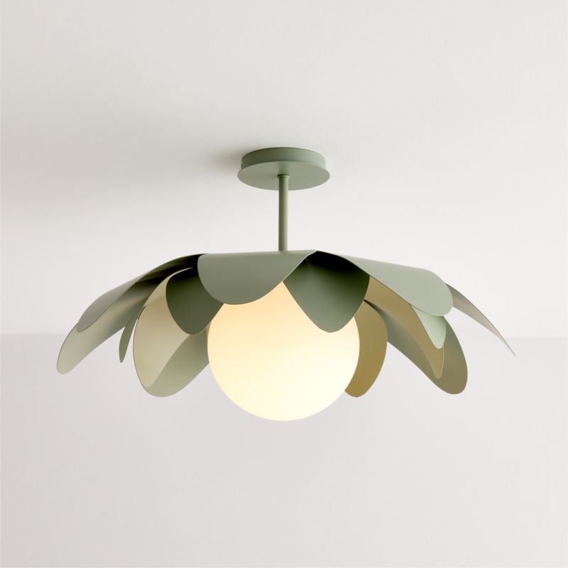 Inspired by a graceful palm-tree canopy, our Palm flush mount light brings a breezy touch of the tropics indoors. Powdercoated metal layers curve like laid-back fronds, finished in a soft, calming hue that instantly freshens the room. Beneath it all, a frosted acrylic globe acts like sunlight filtering through leaves to add a warm glow every time the light switches on.
