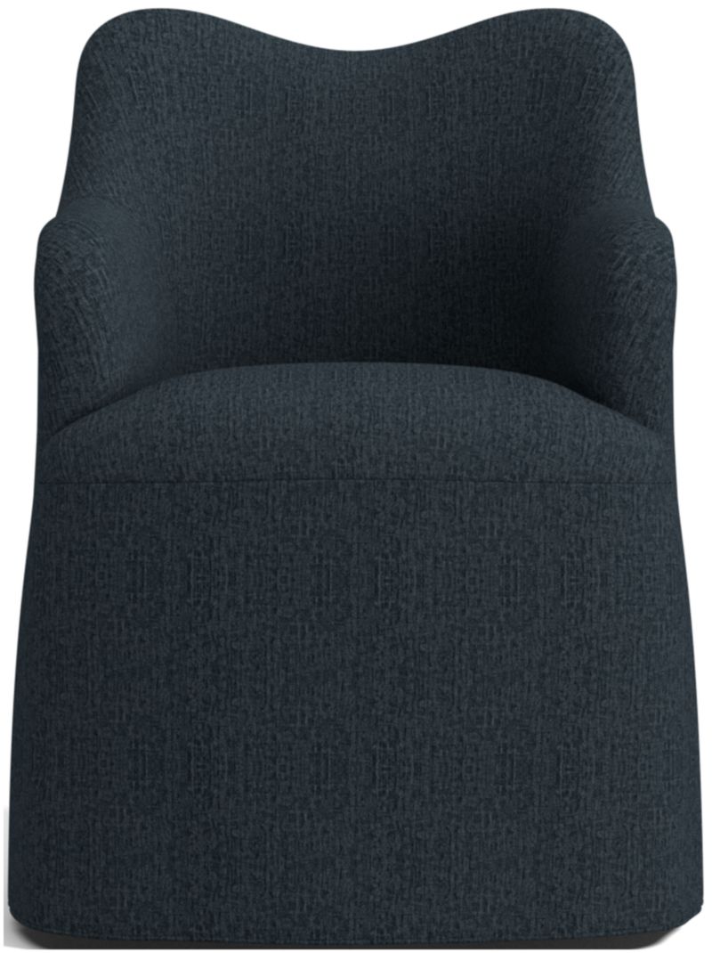 Channeling the rounded contours and relaxation of a living room armchair, our Paloma dining chair serves up fresh wingback curves along with table-lingering comfort. Tight tailoring of the upholstery highlights the sculptural form while keeping the look neat and refined. We love the subtle sense of movement and casual slipcover flair that the skirted seat lends to the chair's relaxed elegance. And Paloma swivels a full 360 degrees, letting you easily follow tableside conversation and take a sweeping view of the dining room.