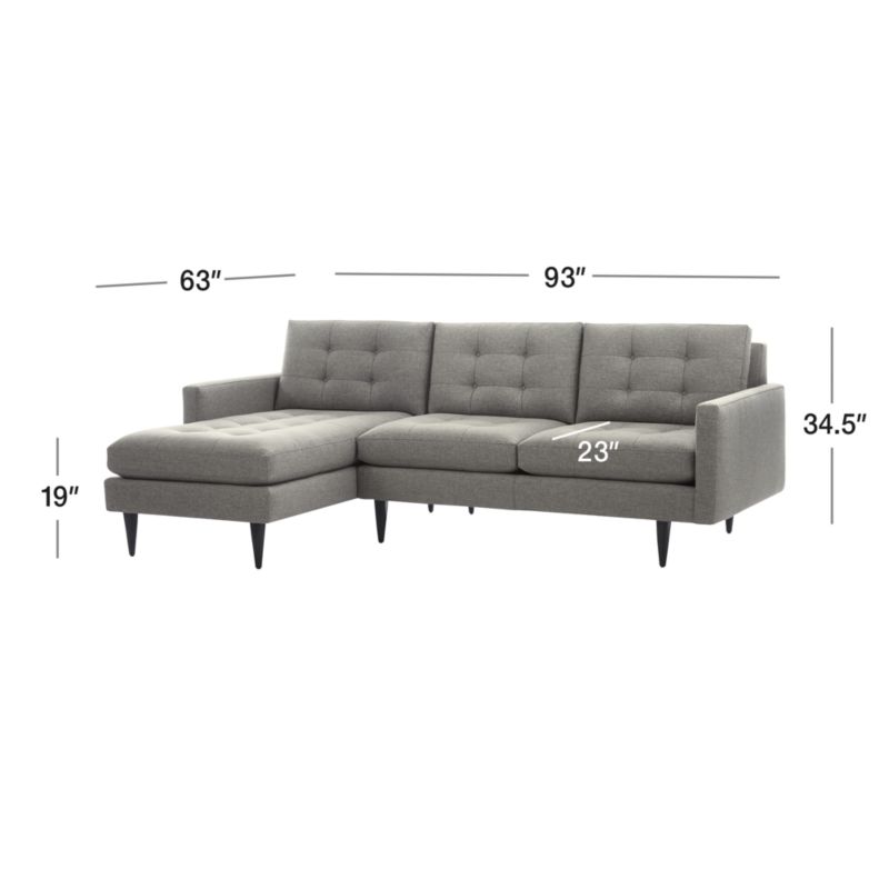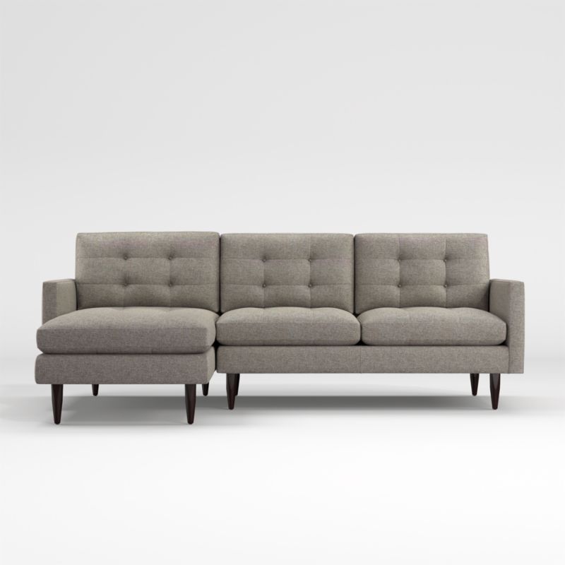 Now a Crate and Barrel classic, its pure 1960s aesthetic is scaled deep so you can sit firm and upright, but also slouch back in comfort. Well-suited to make a great impression, the menswear-inspired fabric tailors Petrie's sleek, boxy cushions and slim track arms with heathered color and soft texture. Here, we've paired the right arm loveseat and left arm chaise; you might also choose to add companion pieces from the Petrie Sectional Collection. Petrie 2-Piece Left Arm Chaise Midcentury Sectional Sofa is a Crate and Barrel exclusive.
