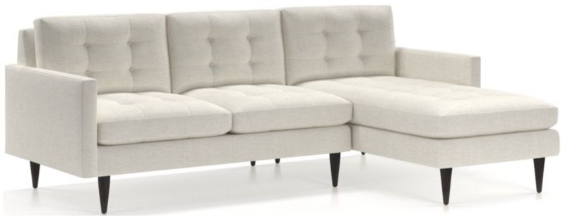 Now a Crate and Barrel classic, its pure 1960s aesthetic is scaled deep so you can sit firm and upright, but also slouch back in comfort. Well-suited to make a great impression, the menswear-inspired fabric tailors Petrie's sleek, boxy cushions and slim track arms with heathered color and soft texture. Here, we've paired the left arm loveseat and right arm chaise; you might also choose to add companion pieces from the Petrie Sectional Collection. The Petrie 2-Piece Right Arm Chaise Midcentury Sectional Sofa is a Crate and Barrel exclusive.