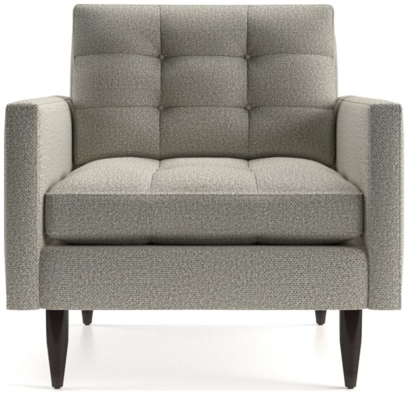 Now a Crate and Barrel classic, its pure 1960s aesthetic is scaled deep so you can sit firm and upright, but also slouch back in comfort. The Petrie armchair looks sharp with sleek, boxy cushions and slim track arms, upholstered in a menswear-inspired fabric with heathered color and soft texture. Petrie Midcentury Chair is a Crate and Barrel exclusive.