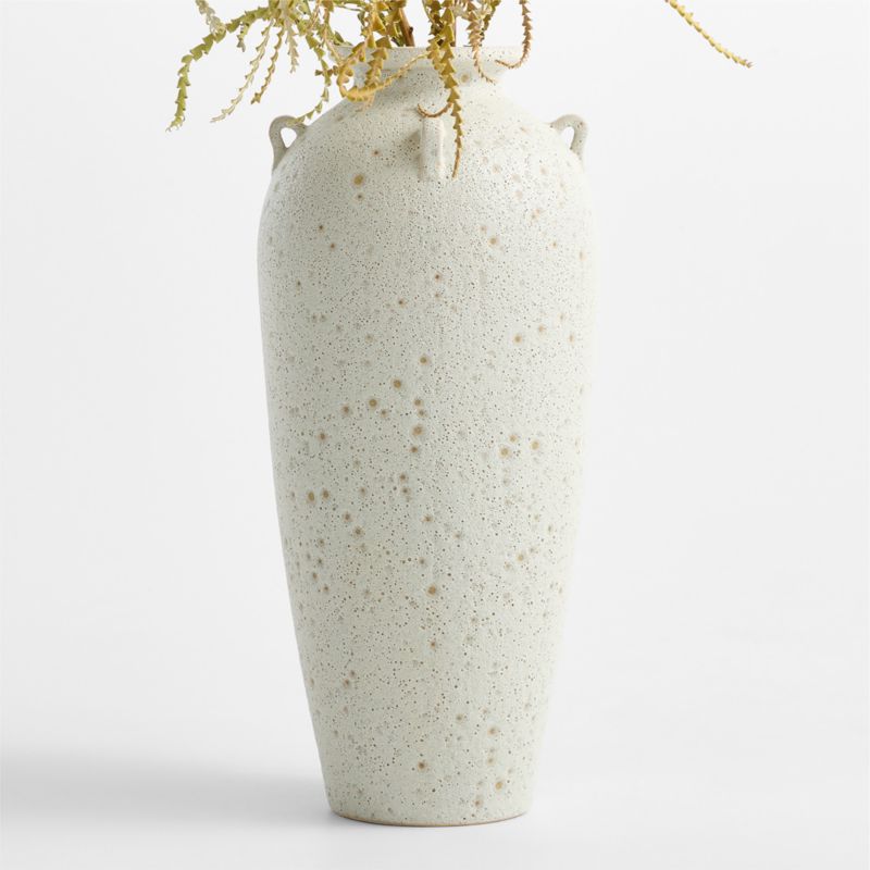 Our Pompeii vase collection fascinates with reactive glazes and artisanal textures that evoke ancient artifacts. Skilled artisans glaze this floor vase by hand in volcanic white that allows glimpses of the clay below. The organic texture of the finish and the charming handles warm the vessel's classical silhouette. Display on its own, filled with tall botanicals or grouped with our other Pompeii pottery on a bookshelf, buffet or mantel.