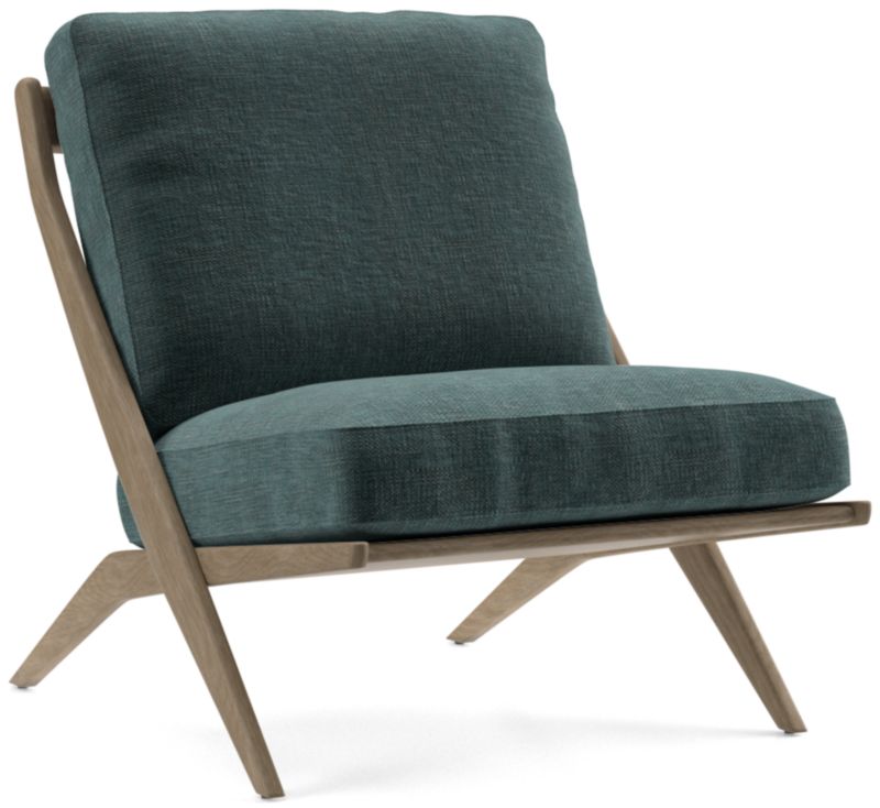The classic slipper chair takes on mid-century vibes in our Pose chair. The solid ash frame tilts back with cantilever angles for a comfortable recline, showcasing the wood's beautiful grain washed in warm grey. Clean-lined seat and back box cushions offer just the right mix of fiber and down for a comfortable yet supportive sit, while the linen-like upholstery layers on soft, touchable texture. The Pose grey wash accent chair is a Crate & Barrel exclusive.