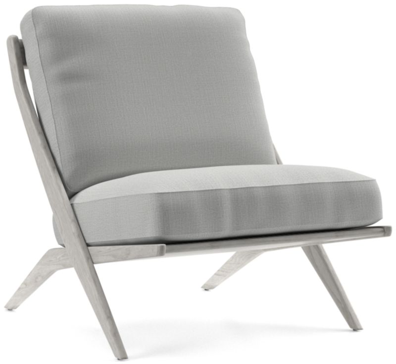 The classic slipper chair takes on mid-century vibes in our Pose chair. The solid ash frame tilts back with cantilever angles for a comfortable recline, showcasing the wood's beautiful grain washed in warm grey. Clean-lined seat and back box cushions offer just the right mix of fiber and down for a comfortable yet supportive sit, while the linen-like upholstery layers on soft, touchable texture. The Pose grey wash accent chair is a Crate & Barrel exclusive.