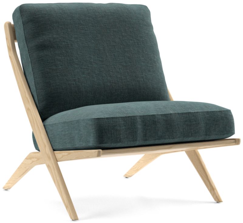 The classic slipper chair takes on mid-century vibes in our Pose chair. The solid ash frame tilts back with cantilever angles for a comfortable recline, showcasing the wood's beautiful grain and natural color. Clean-lined seat and back box cushions offer just the right mix of fiber and down for a comfortable yet supportive sit, while the linen-like upholstery layers on soft, touchable texture. The Pose natural accent chair is a Crate & Barrel exclusive.