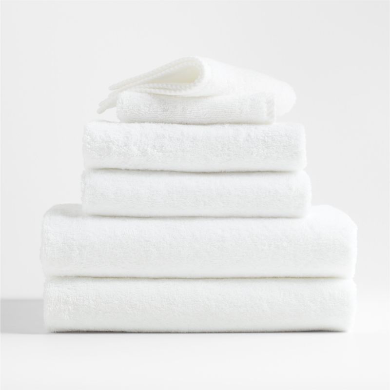 Instantly upgrade your bathroom, en suite or guest bath with this set of six quick-dry organic cotton towels. White organic Turkish cotton weaves seriously soft, fluffy and durable towels with a secret superpower: quick-dry technology. The long-staple yarns are spun using a unique method that creates air pockets between the fibers, increasing the textiles' absorbency, decreasing their drying time and creating a super-fluffy finish. A Crate & Barrel exclusive, the set includes two washcloths, two hand towels and two bath towels in white.