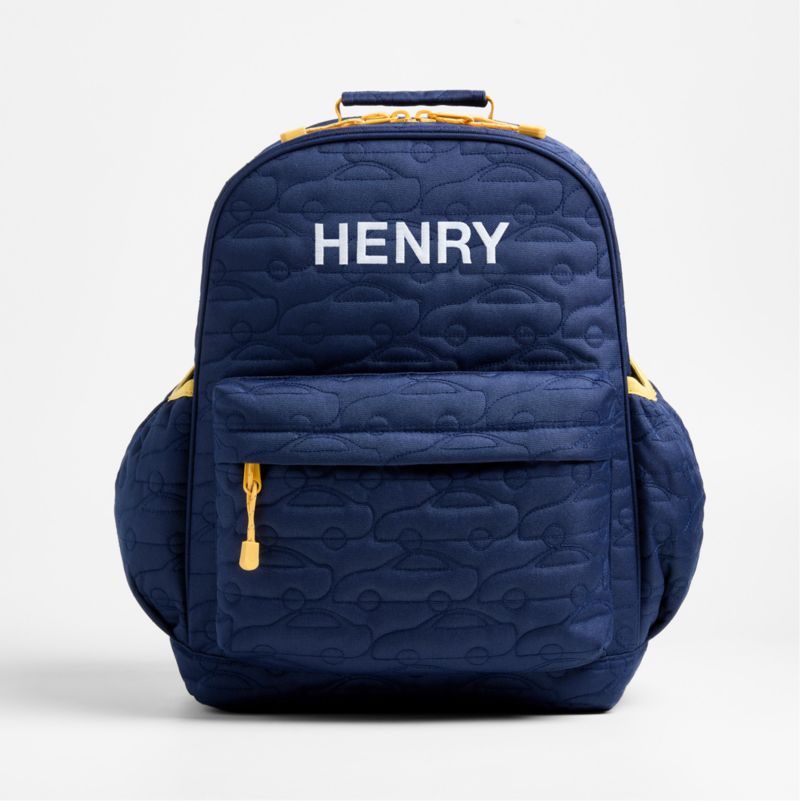 A backpack that's extra comfy and ready to handle all the adventures of the day. A pattern of quilted cars zoom across the bag's navy blue exterior, and contrasting yellow trim gives it the perfect finish. Constructed of supremely durable polyester fabric that includes recycled plastic bottles, this large knapsack's roomy interior holds everything your kid needs—books, school supplies, extra layers—and there's a padded pocket to keep their tablet protected. Outside pockets hold snacks, water bottles and more. Pair this book bag with the matching Quilted Blue Car lunch box for a totally coordinated look.
