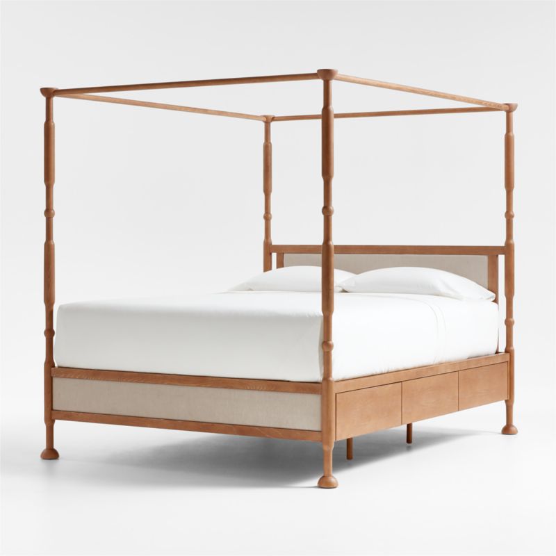 This canopy bed's lofty profile brings instant drama to a kid's room, but it's the delicate details that really stand out: the intricately carved frame, the visible wood grain in a rich hazelnut finish, and the inset fabric panels on the headboard and footboard. This storybook piece has a practical side, too—three built-in drawers for stashing pajamas, blankets or bedtime books.