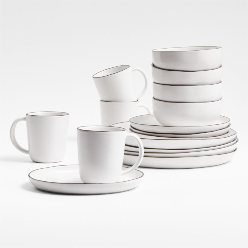 Rimmed in black, our white-glazed Range dinnerware showcases its perfectly imperfect artisanal edges. Hand-finished and -painted by talented craftspeople, the 16-piece set presents meals with a laid-back yet elevated look. The fine stoneware dinner plates, salad plates, bowls and mugs—four of each—go from warm oven to table then clean up easily in the dishwasher. Set a harmonious table with the coordinating black-and-white serveware and accessories in our exclusive collection designed by Leanne Ford.