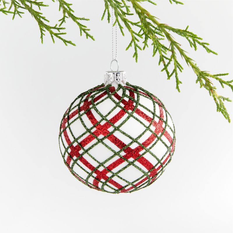 Made of hand-blown glass and painted by hand, our artisan-crafted ball Christmas tree ornament brings holiday plaid to the Christmas tree. A favorite holiday pattern, the festive tartan layers glitter swirls in red and green on snow-white glass. Made for us exclusively, this lovely glitter plaid Christmas tree ornament adds sparkle to both traditional- and modern-style holiday decor.