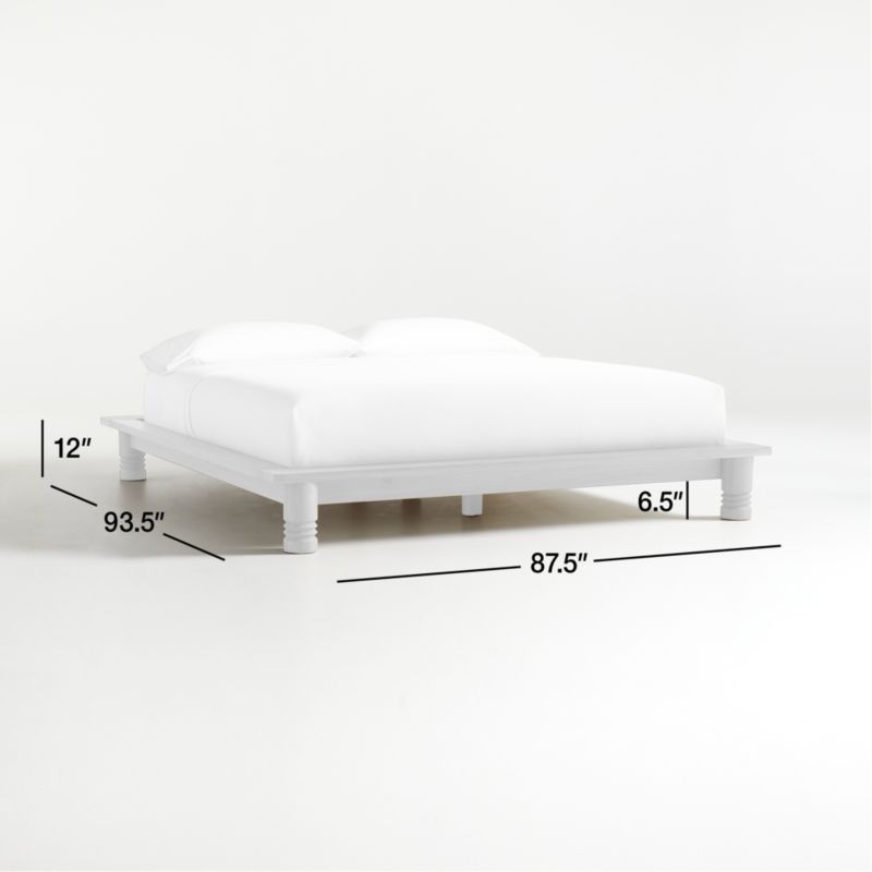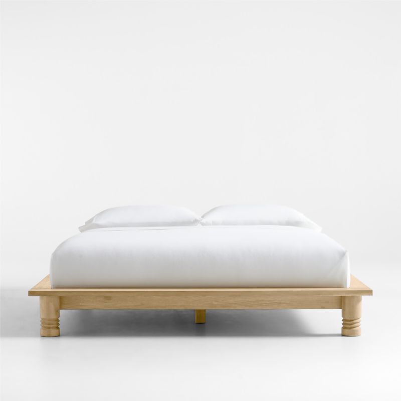 Simple reads refined and modern in Athena Calderon's Revival bed. Crafted of sustainably sourced oak and oak veneer, the platform bed creates a table-like support that extends beyond the mattress for a minimalist look. Chunky cylindrical legs elevate the bed, showing off Athena's design-defining carved ridge detailing. Ours exclusively, the Revival wood bed pairs with an optional headboard sold separately.