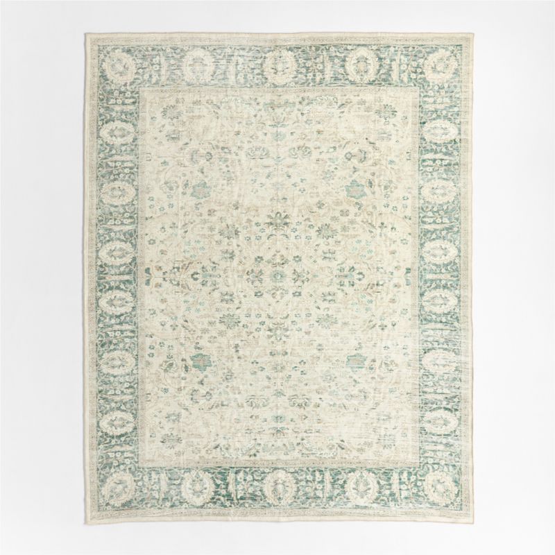 Our Sadira washable area rug channels the beauty of a classic Persian design with intricate floral motifs in soft sage green, warm taupe and ivory. A rich cocoa-toned border frames the pattern, adding depth and vintage-inspired charm. This rug is built to last with stain-resistant fabric, a low-profile design and a non-slip backing that keeps it in place as life unfolds. It's a cozy, classic foundation for elevated kid spaces—and since it's machine-washable, keeping it looking fresh is a snap.