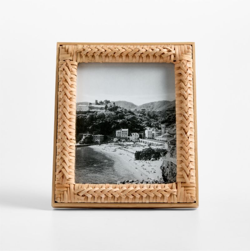 Our Sarina frame surrounds a beloved image with seaside style. A border of intricately handwoven rattan—the fiber of a tropical climbing palm—is inset within ashwood in the same sandy hue. Pair with the smaller raffia Sarina frame for a coastal chic display of photos or art.