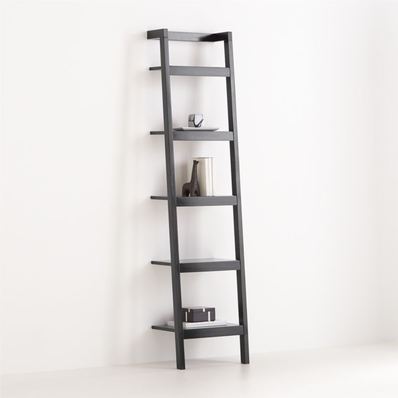 Space-saving, clean-looking Sawyer uses an ingenious leaning, modular design to creatively solve storage solutions throughout the home. The solid hardwood bookcase ladders five deep shelves. Thick shelf fronts and a chic black finish add graphic contrast to the supporting wall and accentuate the bookcase's architectural lines. Group bookcases together, add a desk or mix in other pieces from our exclusive Sawyer collection for a custom lineup.