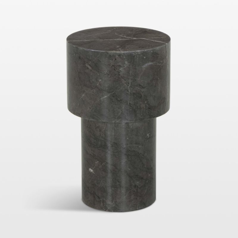 Simple geometric shapes and the sleek look of marble give the Guthrie end table its contemporary appeal. Combining a cylinder base with a drum-shaped top, the table plays with proportions as it highlights the beauty of solid black marble patterned with subtle grey veining that's unique to each piece.
