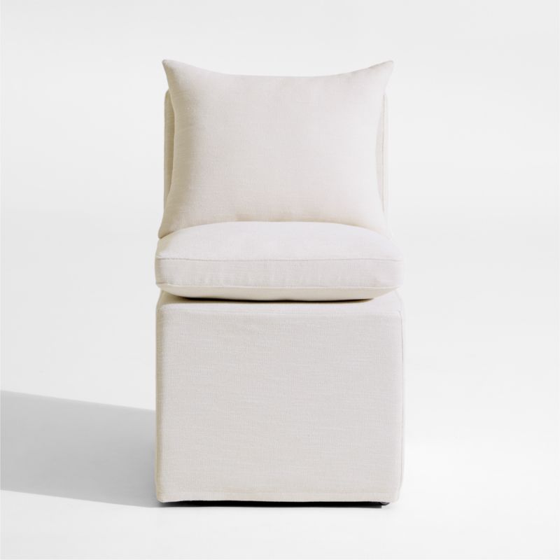 Our fully upholstered outdoor dining chair plays host to extra-plush, pillowy-soft seat and back cushions. Removable and machine washable, the crisp white slipcovers in a linen-textured fabric enhance the chair's casual attitude and beachy flair. The chair comes with two feet options—stationary for a classic look or casters for easy maneuvering.