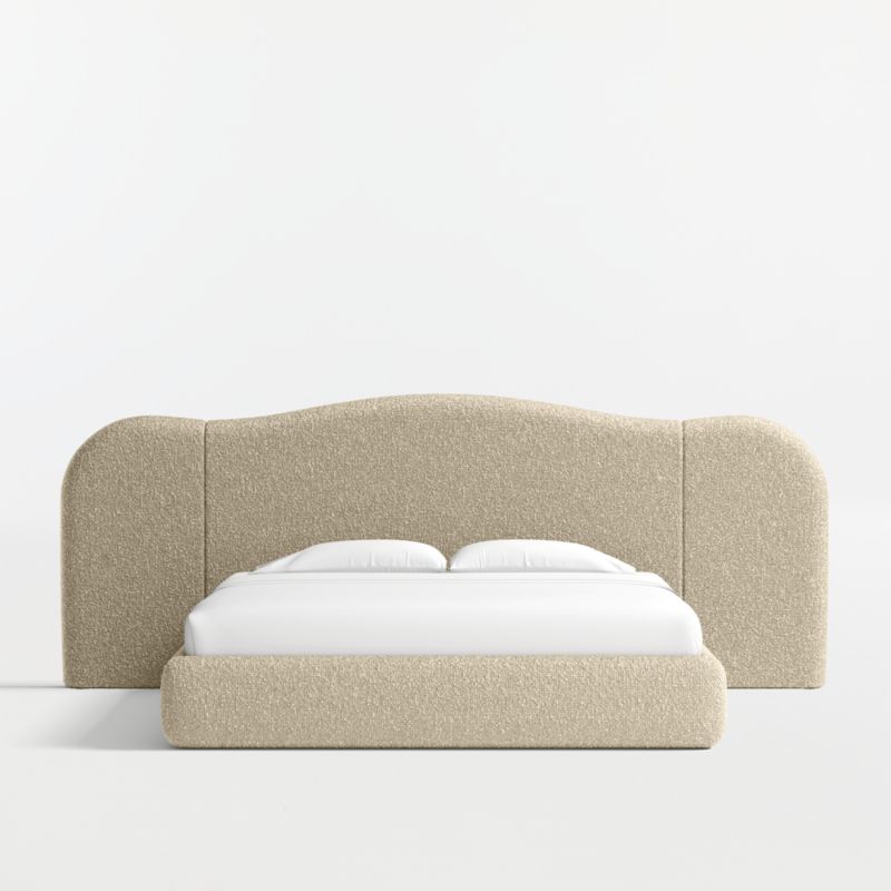 Our Seraph bed makes a modern statement while keeping the look warm and cozy. Sculpted with gently waving contours, the headboard extends wings beyond the frame for a sheltering feel. The rounded rails and footboard continue the cushioned contours, upholstered in a wonderfully soft, textured boucle.