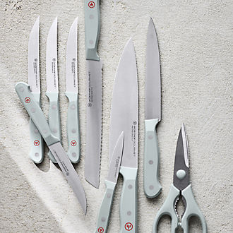 Every chef worth their salt knows that knives are the true heroes of food preparation, so it's important to purchase yours from a quality kitchen knives brand. Although having a sharp blade is important, the balance of the handle and weight of the overall piece also contribute to the results and safety of your knife, so be sure to explore a few different options before selecting from among the many cutlery brands. If you're partial to German design, explore Zwilling, Wusthof and Schmidt Brothers knives. Cutlery from these brands, as with most German knives, tends to be more durable and versatile than their Japanese counterparts. Japanese knife brands have their own benefits, however, including sharper edges and precision balance. If that sounds more your style, Global, Shun and Cangshan knives are available both as open-stock and in sets. Preparing filet mignon for a dinner party or date night? Don't forget about knives for serving the meal as well. Laguiole steak knives allow you and your guests to slice through tender cuts of meat with ease, maximizing your enjoyment of the meal.