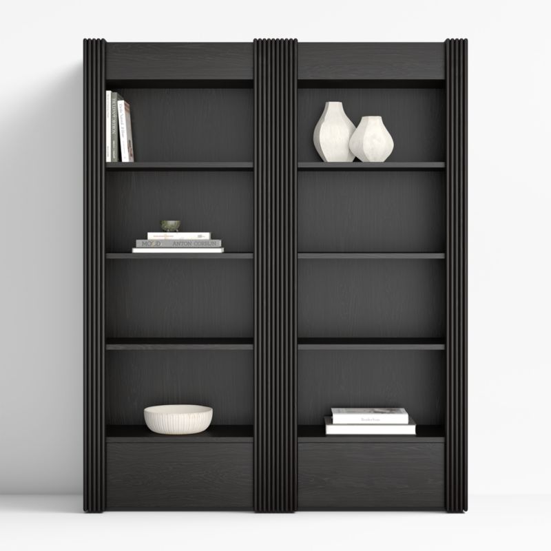 Grand in statute but light in footprint, Siena has the look of a custom built-in bookcase. A black finish highlights Siena's striking silhouette and highlights the rich grain of solid ash and ash veneer. Ribbed columns frame the bookcases in texture as they exaggerate the vertical reach. Three adjustable shelves per bookcase provide an open display of books and collectibles, while a single push-open drawer at the base offers closed storage.