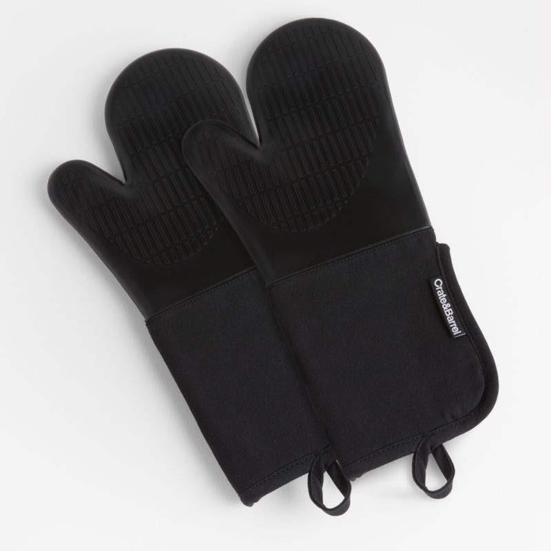 Keep your cool with our exclusive black oven mitt with silicone grip. Lined with terry cloth, the organic cotton mitt protects your arm and hand as you cook or bake. The silicone grip provides a solid, heat-resistant hold on hot skillet handles, cast iron pans and just-from-the-oven baking dishes. When not in use, the silicone oven mitt hangs within easy reach thanks to a hanging loop and hidden magnet. For a cohesive look, pair with the matching pot holder and our other black kitchen textiles.