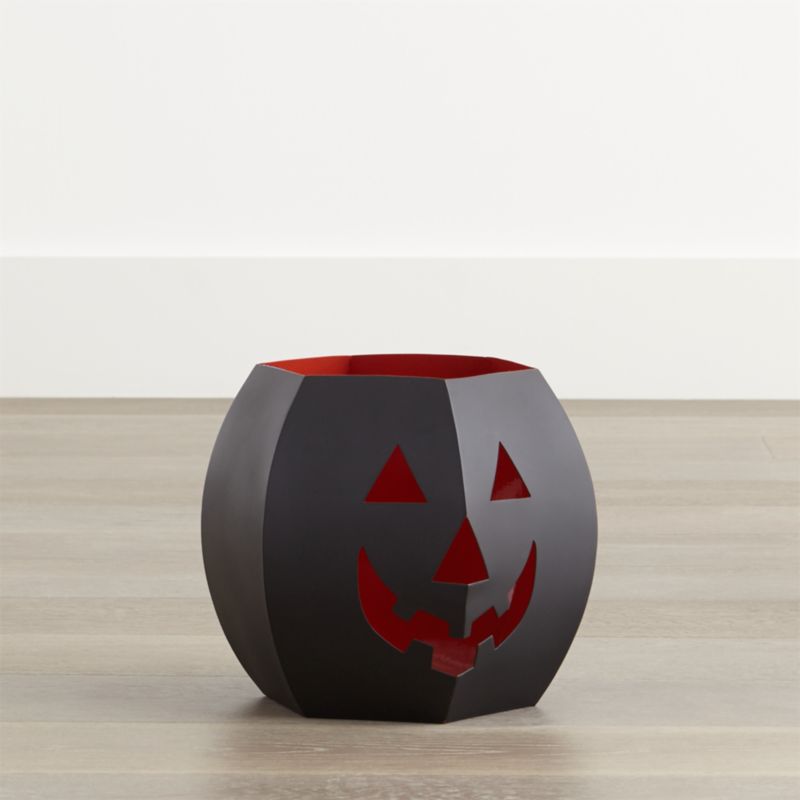 Line your sidewalk or porch with this friendly iron pumpkin lantern, with cutout features and faceted shape to resemble carved jack o'lanterns. A Crate and Barrel exclusive, the small and sturdy lantern will light the way for years to come. Filled with a wax or flameless pillar candle and pair with our large pumpkin lantern for a charming Halloween display.