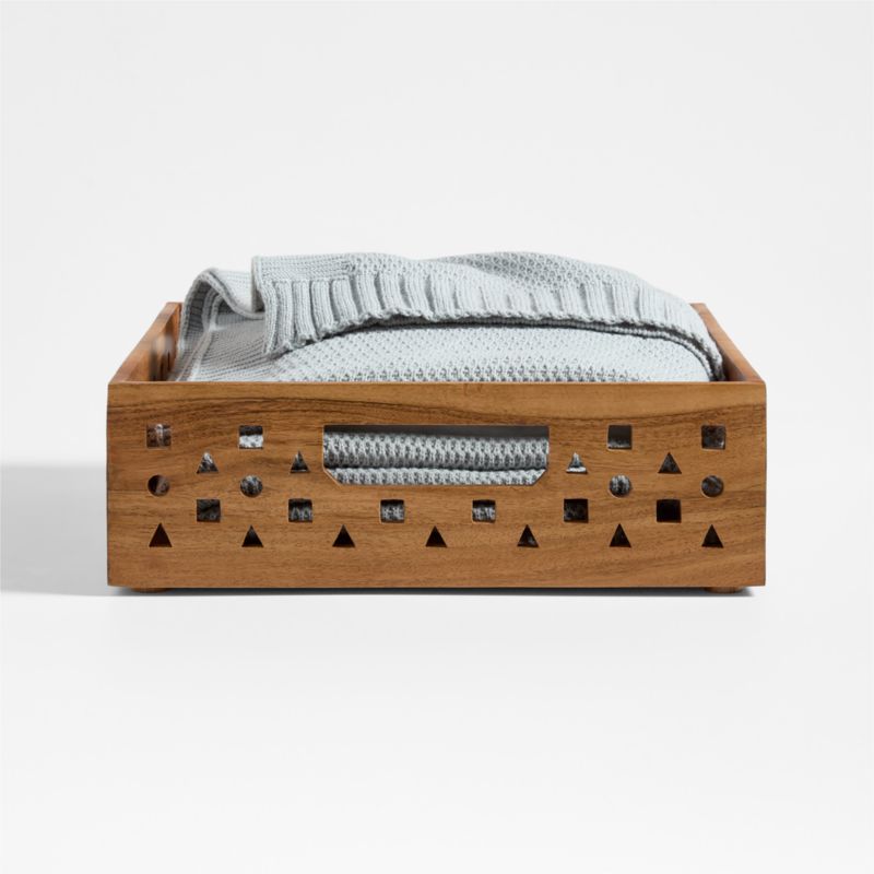 Smart storage meets elevated style. This stackable storage crate features a warm natural finish and geometric cutouts that conceal clutter while bringing character to any playroom or nursery. Stack multiples to build a storage setup that grows with them.