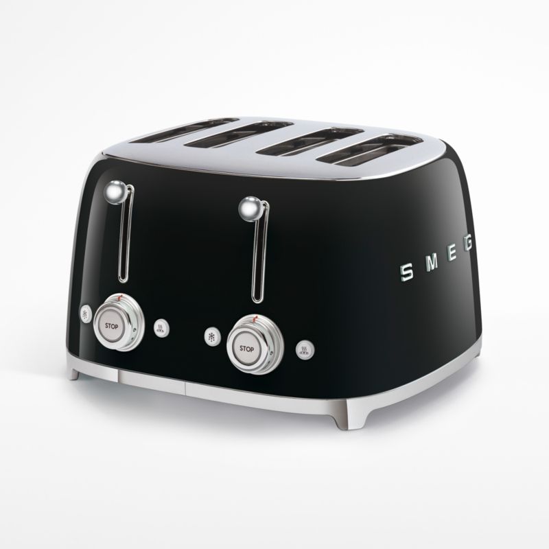 Enameled in black and accented with a charming ball lever knob, this retro four-slice toaster browns bread, bagels and more at six levels with three convenient pre-set programs. Two control panels ensure everyone's toast is done to their specifications. Four extra-wide slots accommodate different slice widths, and self-centering racks ensure even toasting.