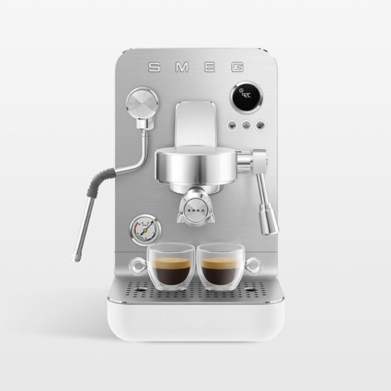 Retro style meets modern tech in this espresso maker from SMEG. With its rounded corners, stainless steel face, matte white finish and chrome details, this machine brings delicious espresso drinks and streamlined style to your kitchen. The semi-automatic functionality allows for manual or automatic espresso extraction and milk frothing. Equipped with a triple heating system, the machine warms up quickly and allows for precise temperature control.