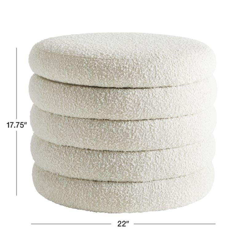 Store favorite toys and beloved blankies in style with this storage ottoman designed by Leanne Ford. Crafted with exaggeratedly deep channels for a playful stacked look, the versatile piece offers extra seating, hidden storage and a place to rest tired feet. Upholstered in family-friendly, irresistibly nubby boucle, the cream ottoman opens easily with a lift-off top. To create a snuggly spot for reading, feeding and rocking to sleep, pair the Snoozer Cream Storage Ottoman with the coordinating glider.