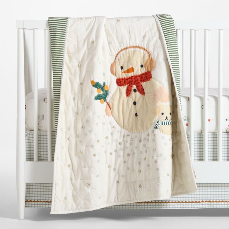 One side of our Snow Friends Organic Cotton Crib Quilt features a charming snowman and snow puppy, printed from hand-painted artwork and accented with texture-rich hand embroidery. On the other, a festive green-and-white stripe adds color and whimsy. Personalize it with your child's name, and use the heirloom-quality piece for tummy time and storytime all the way through the toddler years.