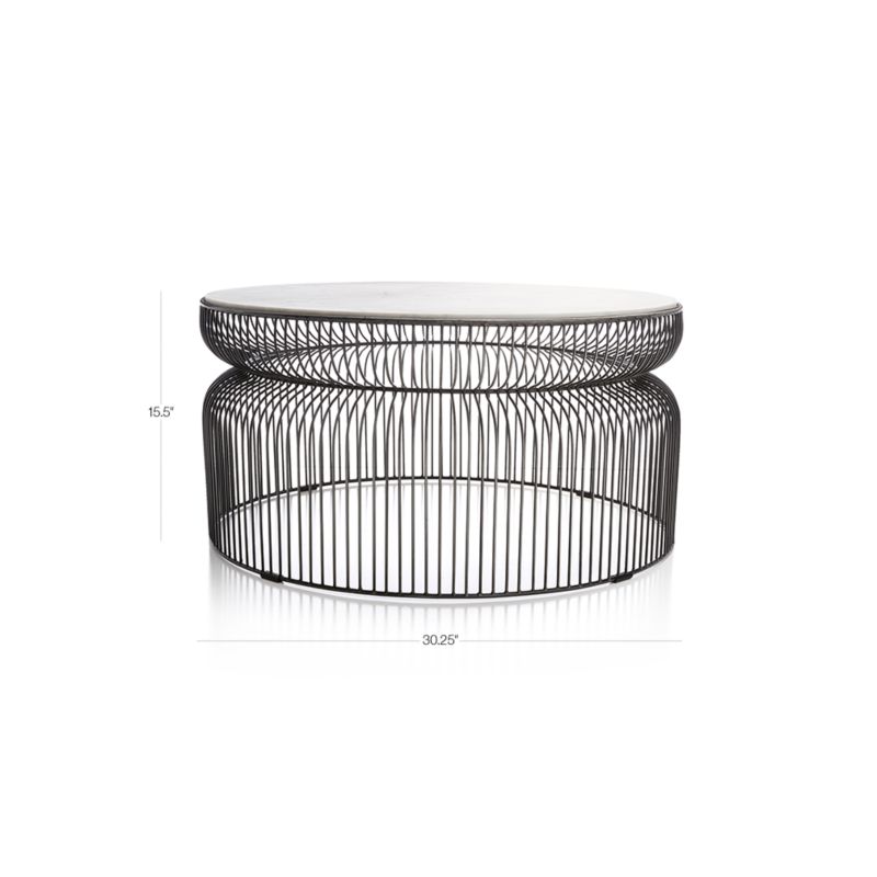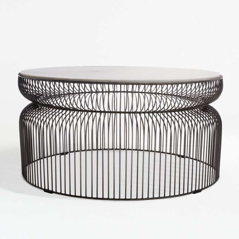 Hand-welded spokes of antique zinc-finished iron wire shape the coffee table's curved, sculptural base, topped with a disk of polished marble. The Spoke Marble Coffee Table is a Crate and Barrel exclusive.