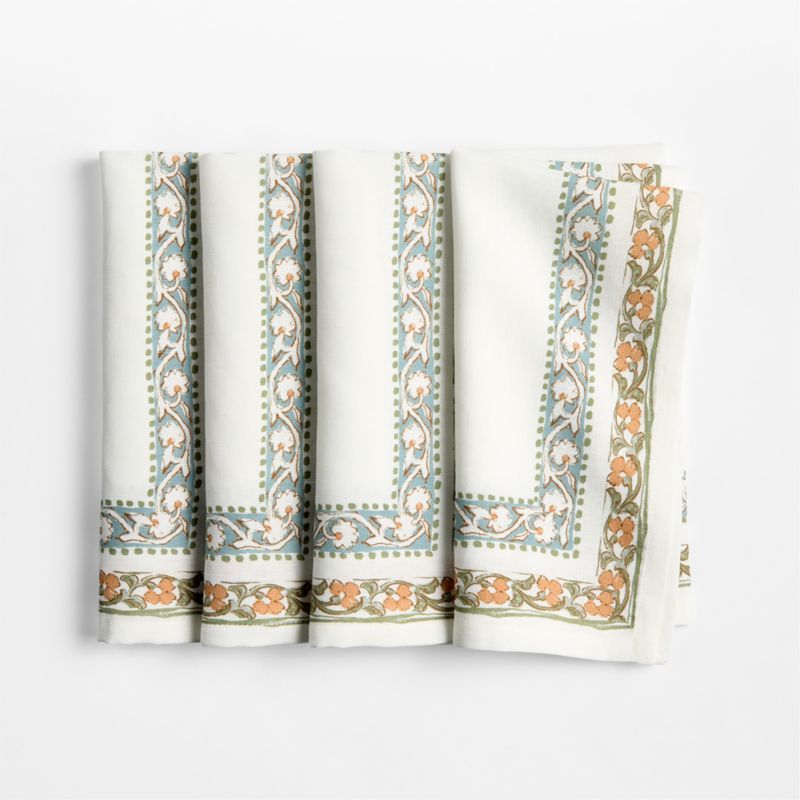 This set of four napkins features a double border of intricate florals inspired by traditional blockprinted Indian textiles. Printed on a linen-cotton blend, the motif is rendered in a soft palette of tan, blue and green.