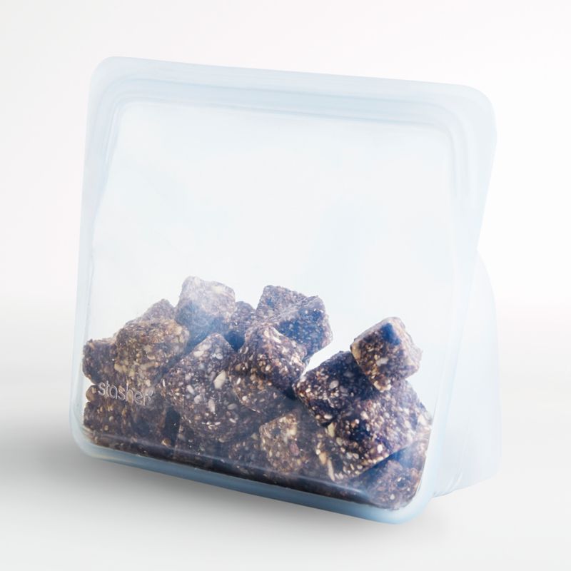 Stash everything from cherry tomatoes to leftover soup to craft supplies in this sturdy resealable sack. Free of petroleum, the clear platinum silicone bag seals tightly, works in a sous vide, can be written upon and is touch-screen compatible. This stand-up size offers three-dimensional storage space for coffee beans, bunches of grapes and toiletries. The reusable silicone bags clean up easily in the dishwasher time after time and are safe to use in the freezer, microwave and oven.