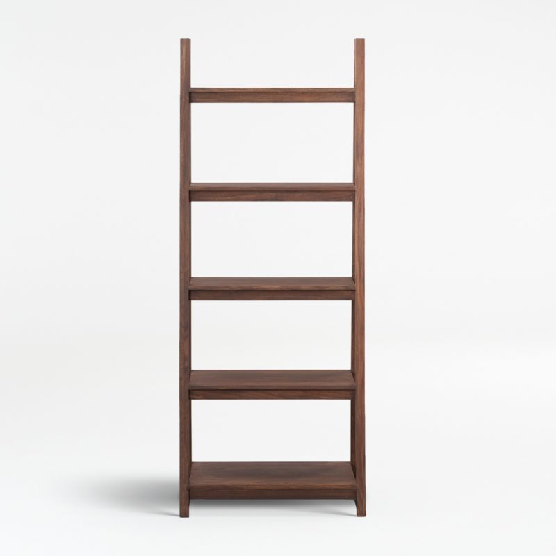 Mark Daniel's innovative ladder-style design stands freely against a wall, stacking five fixed shelves that graduate in depth from top to bottom. Natural wax topcoat adds a smooth matte finish. The Strut Bourbon Bookcase is a Crate and Barrel exclusive.