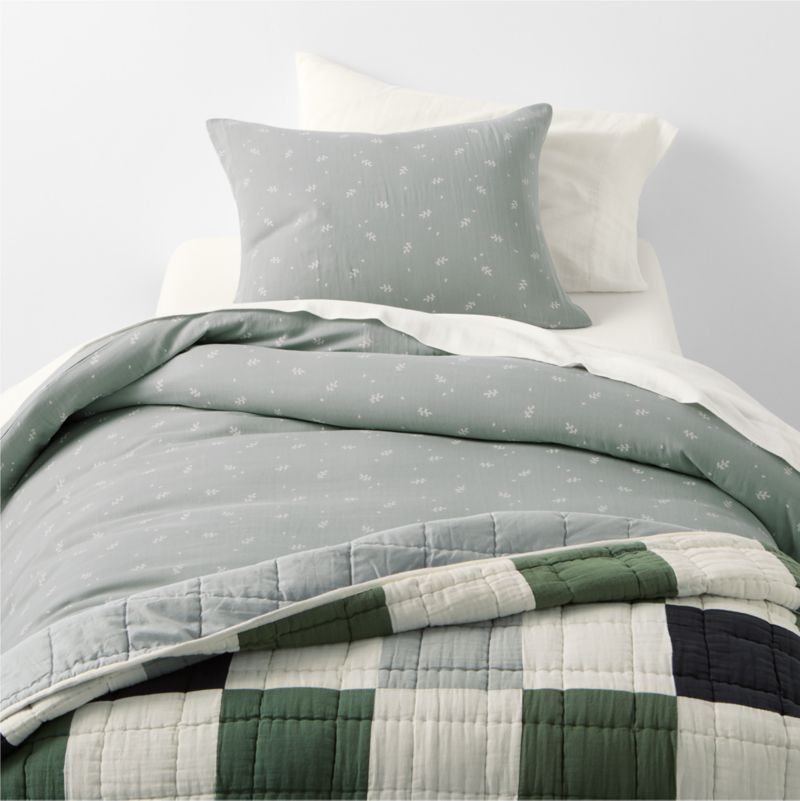 Our Supersoft organic cotton gauze duvet cover combines breathability and warmth to keep kids cozy. It's crafted using a double-layer weaving technique to create pockets of air that hold warmth. And the ivory leaf print adds a subtle touch of nature to their sleep space. Complete the look with our coordinating sheet set and pillow sham, or mix and match with other Supersoft prints, solids and stripes.