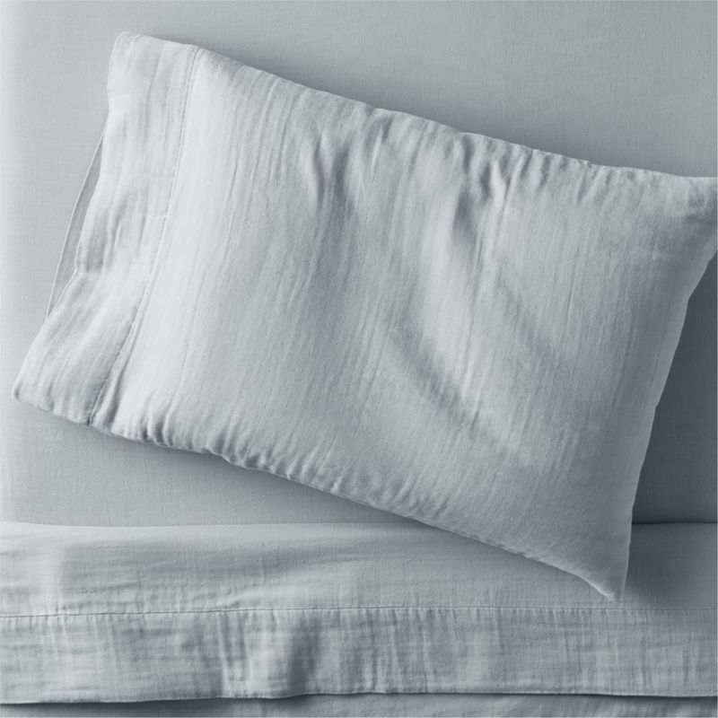 Our favorite bedding basics in dorm-friendly, extra-long sizes. The gauzy SuperSoft sheet set strikes just the right balance of breathability and softness. The double-layer weaving technique creates pockets of air to hold warmth, creating irresistible coziness. Woven of organic cotton in a misty blue hue, the extra-long twin sheet set gives dorm beds an airy, breezy look—especially when layered with other bedding from our SuperSoft collection.