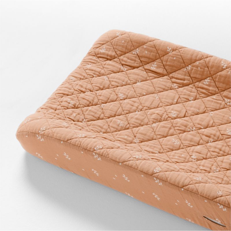 Make changing time comfy and cozy with our Supersoft changing pad cover. A double-layer weaving technique creates pockets of air that hold warmth, while the quilted diamond pattern provides a little extra comfort. And the earthy terracotta hue with ivory leaf print brings a subtle touch of nature to the nursery. Added bonus: It gets softer and fluffier after each wash. Complete the look with the matching Supersoft crib fitted sheet and crib quilt.
